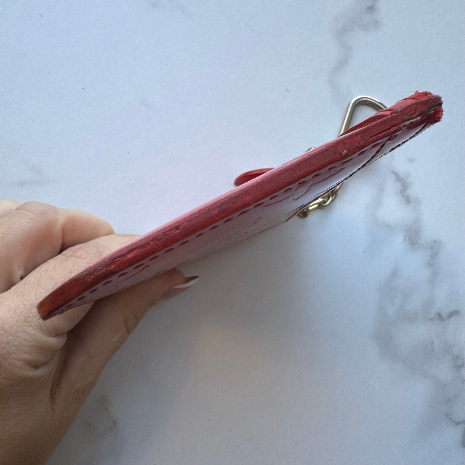 This is an authentic LOUIS VUITTON Card Case crafted of Louis Vuitton monogram embossed vernis patent leather in bright orange. The pouch features a a brass zipper and a hanging brass chain with a D-ring to attach to your handbag. This case opens to a leather interior that is ideal for keys, money, cards or coins.