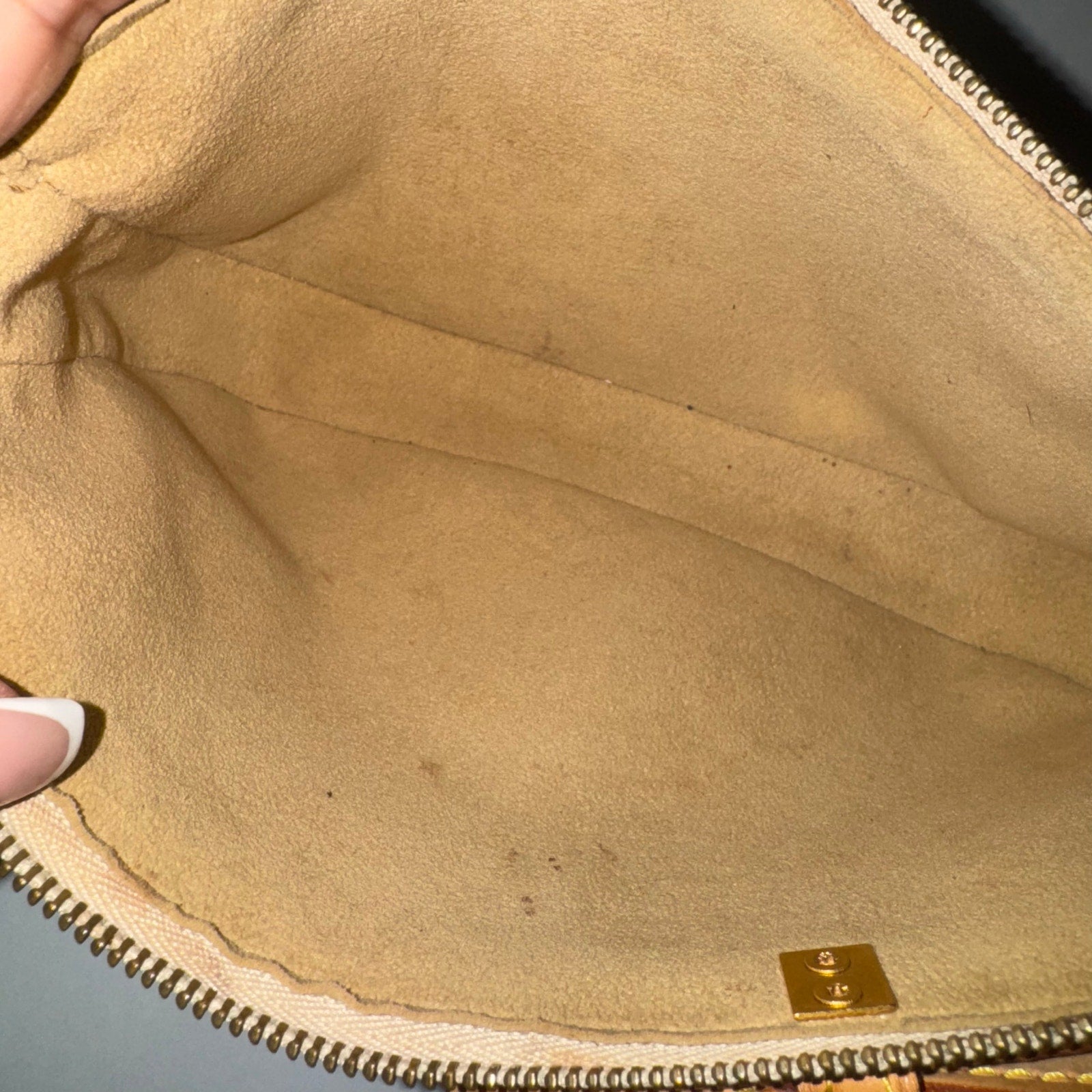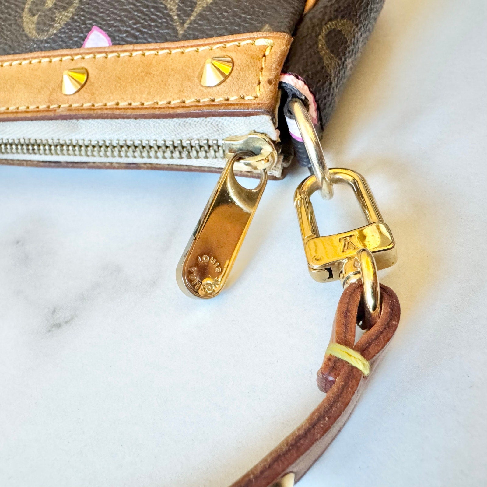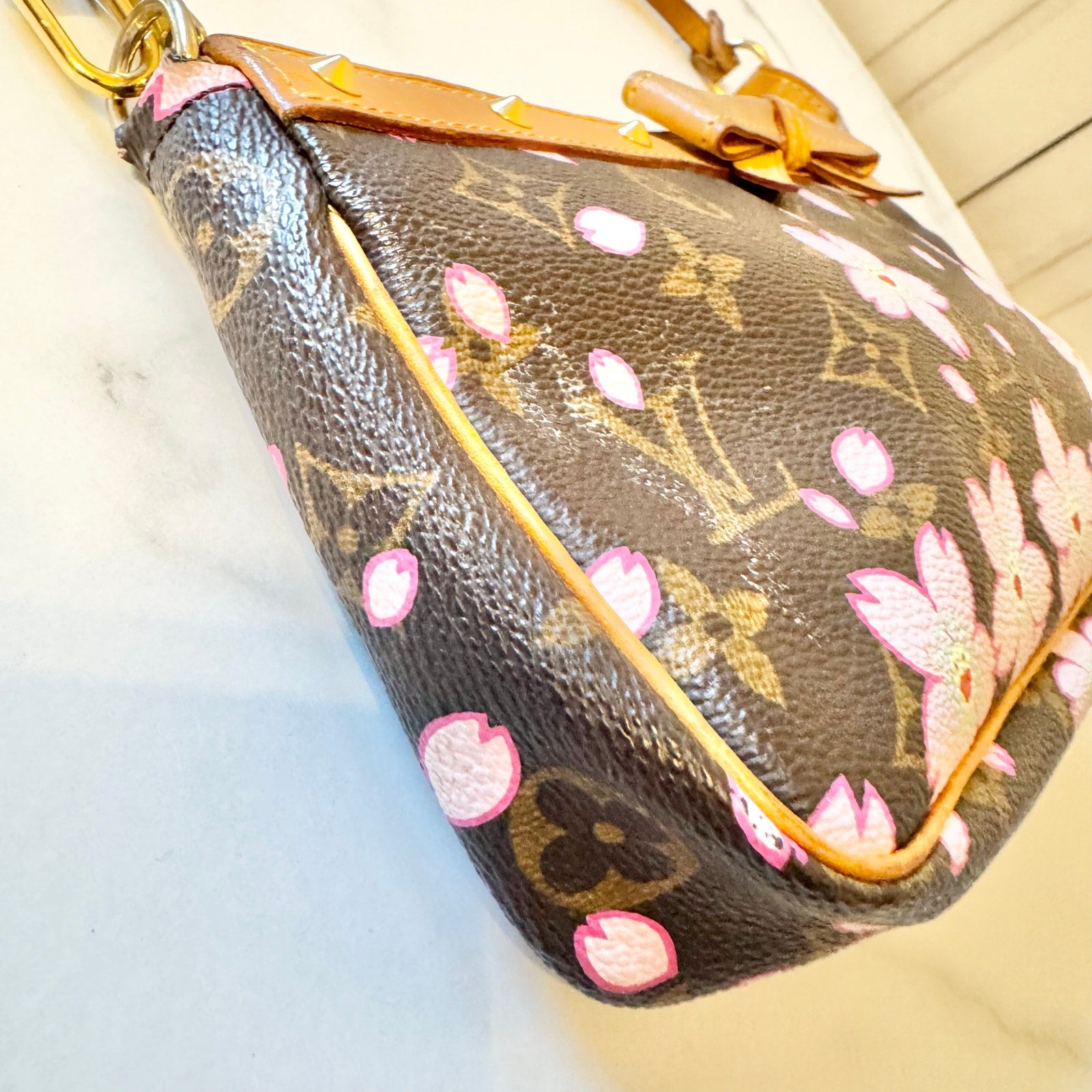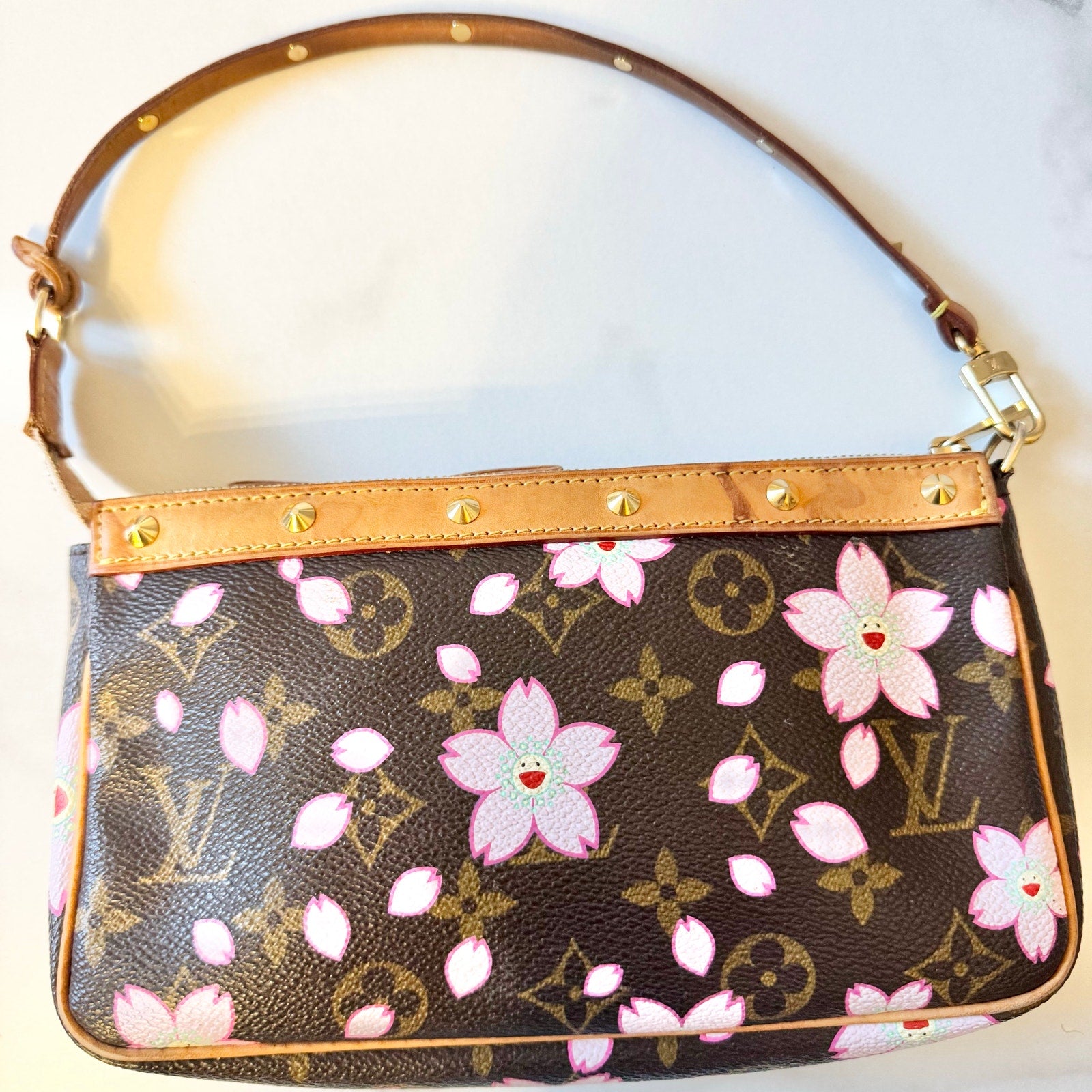 This is an authentic 2003 Louis Vuitton X Takashi Murakami Cherry Blossom Pochette crafted of the traditional monogram toile canvas with the cherry blossom smiley faces and has vachetta leather trim and strap with gold studs. It has soft alcantara lining and gold hardware. It features a removable natural leather strap.