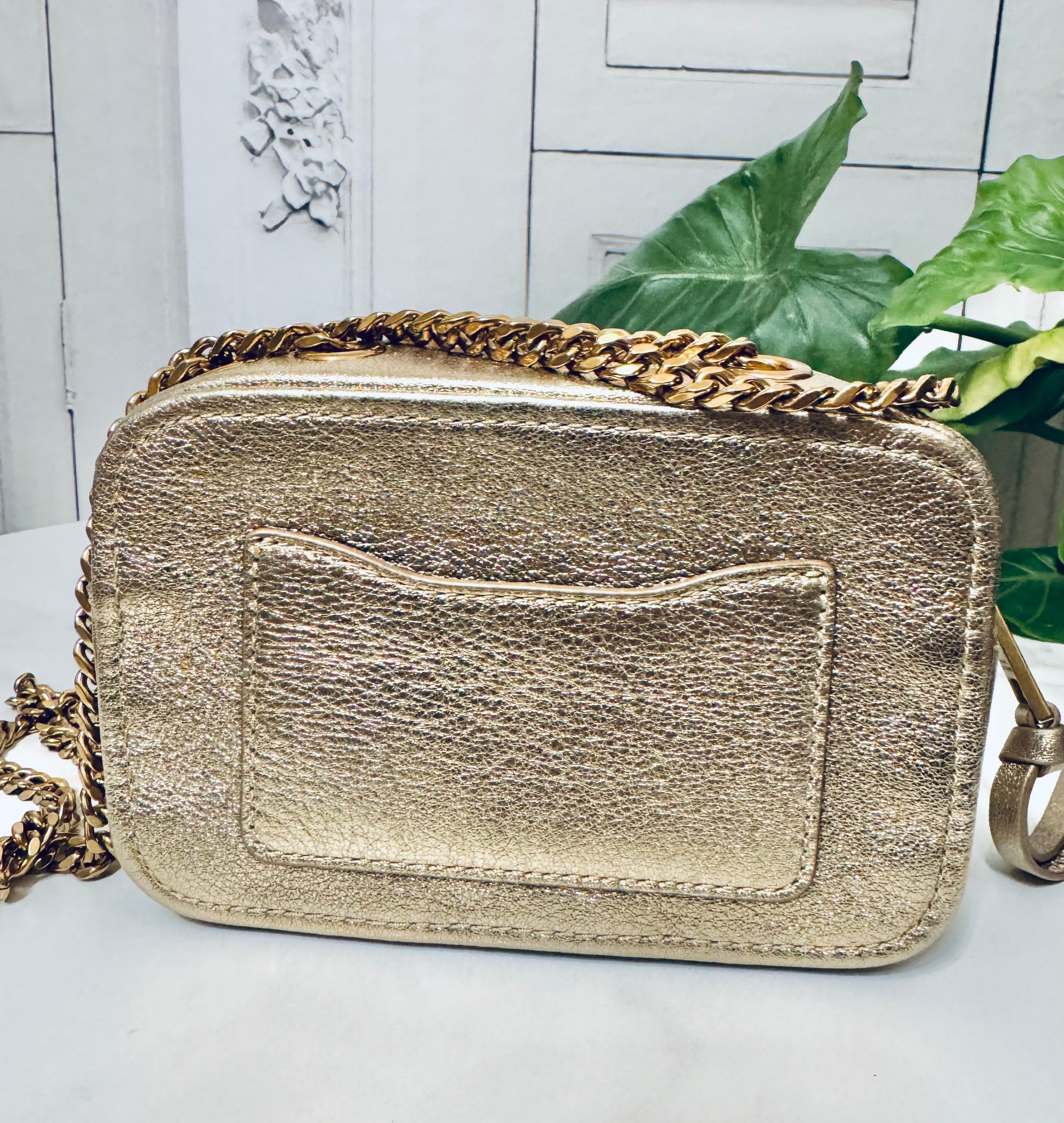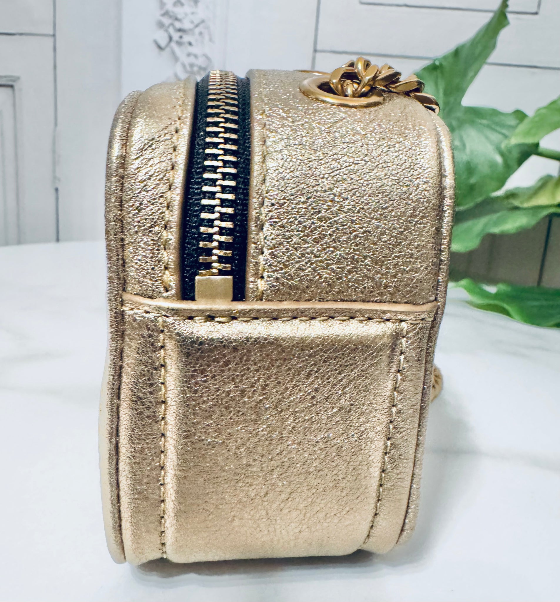 Shoulder bag in calfskin light gold color zip closure sliding chain shoulder strap metal logo on the front interior in fabric slit pockets dimensions: