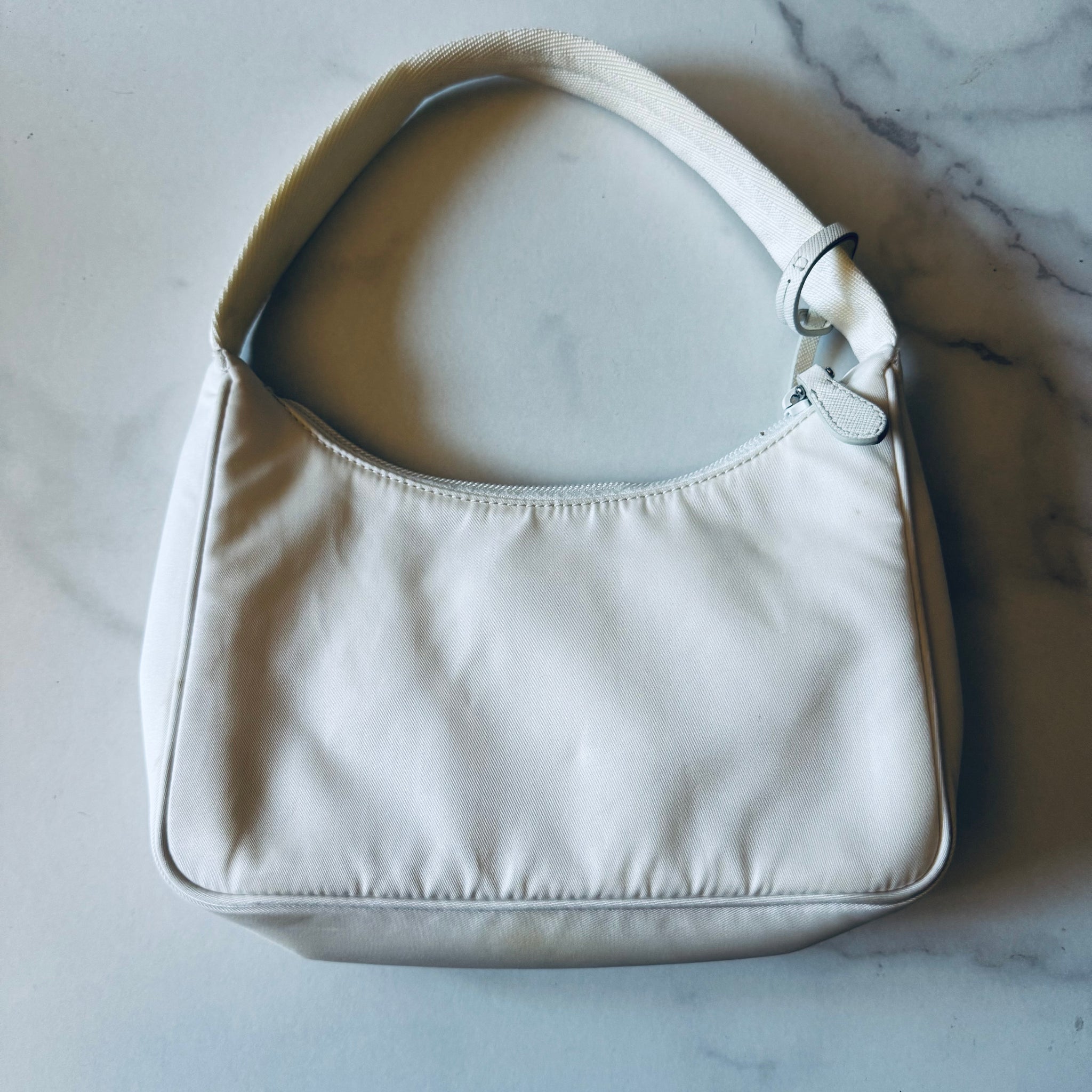 This is an authentic PRADA Nylon Re-Edition 2005 Shoulder Bag in white. Made of innovative Re-Nylon. Zipper closure and woven tape handle is decorated with the iconic enameled metal triangle logo.