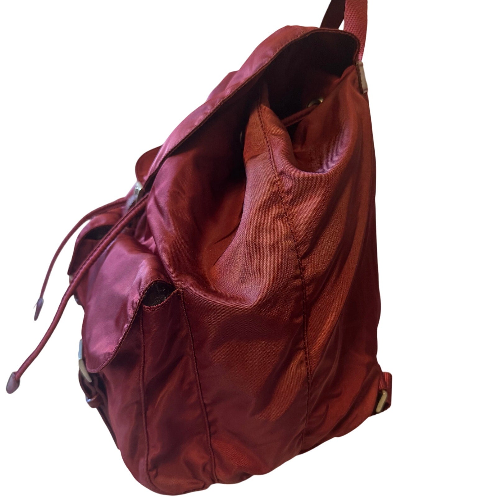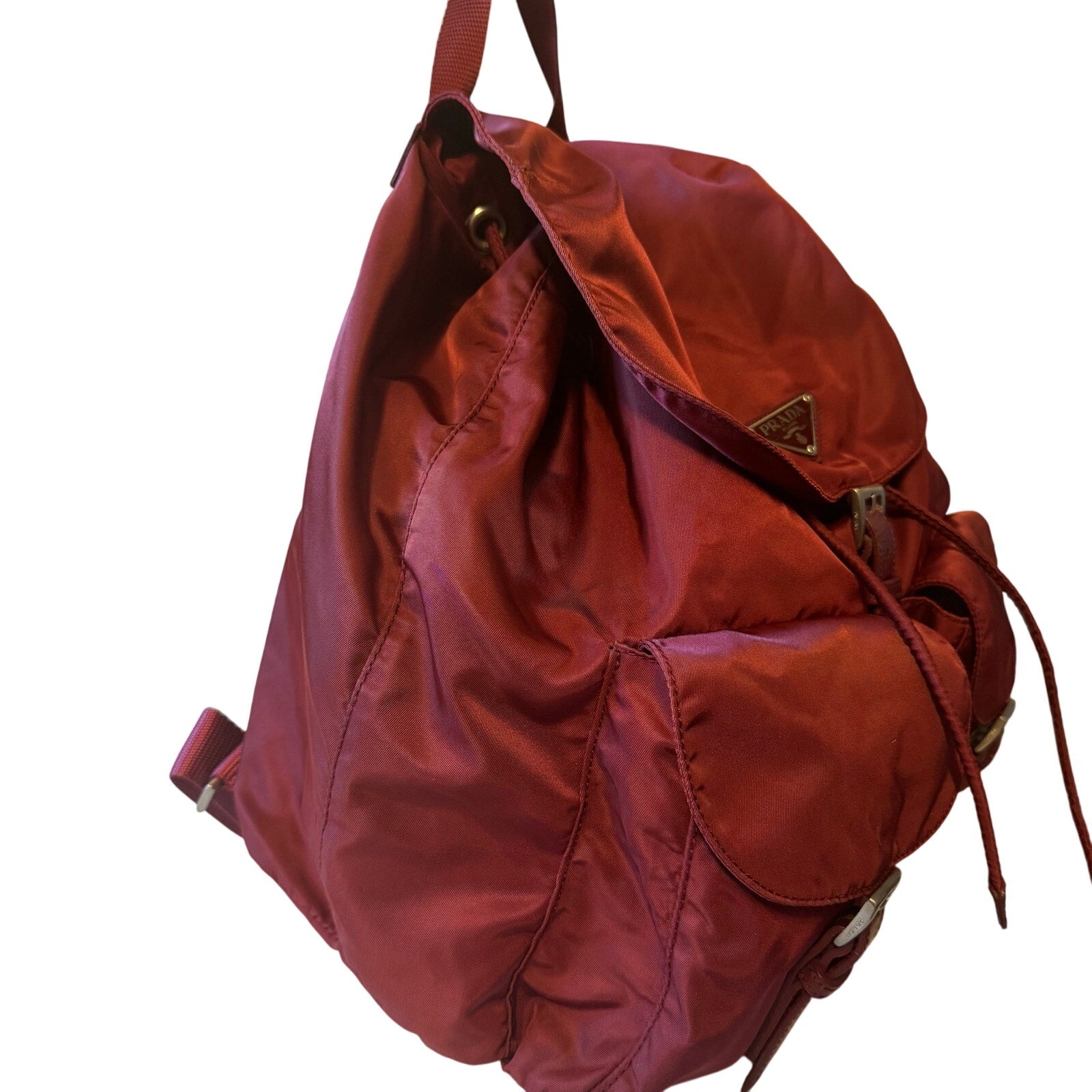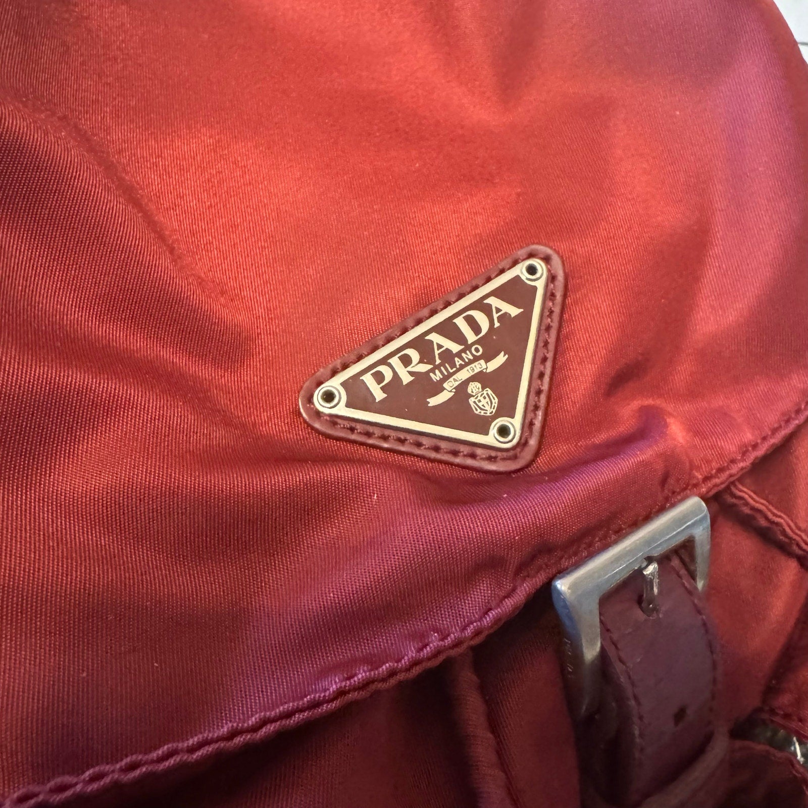 This is an authentic PRADA Tessuto Nylon Vela Medium Backpack crafted of burgundy nylon with leather trim. The bag features front bucket pockets with buckle closure, a fabric top handle, and adjustable nylon shoulder straps. The magnetic crossover flap unbuckles to a top drawstring that opens to a jacquard Prada logo fabric interior with a zippered pocket.