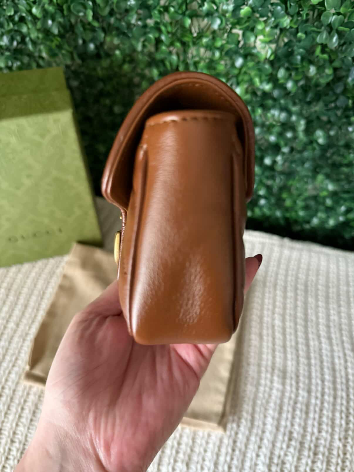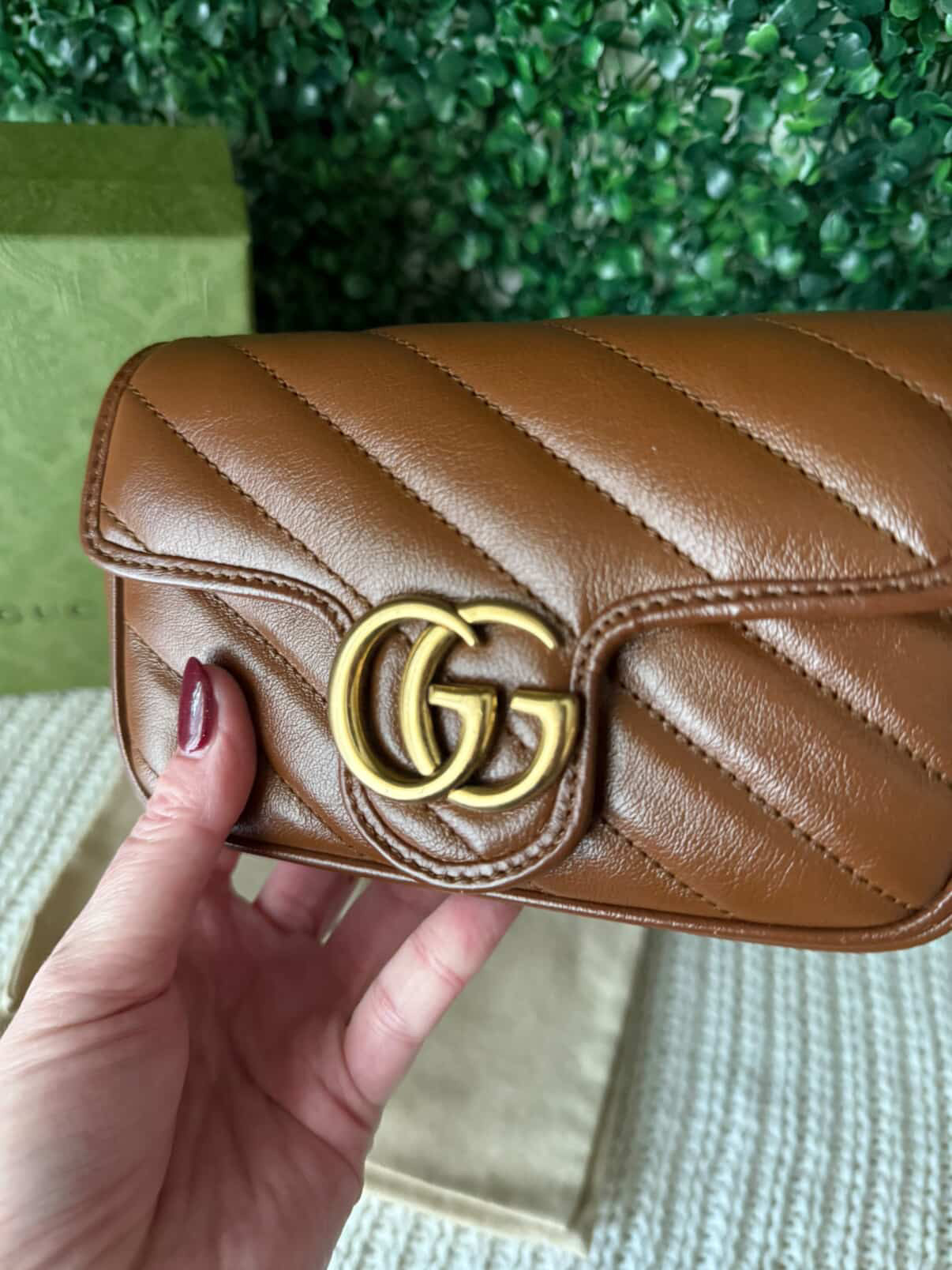 This is an authentic GUCCI Glazed Calfskin Matelasse Diagonal Super Mini GG Marmont Shoulder Bag in Cuir. This shoulder bag is crafted of supple chevron-quilted calfskin leather in brown. The bag features an optional aged gold chain-link shoulder strap and a matching gold Gucci GG logo on the front. The bag snaps open to a beige microfiber interior with a removable key chain.