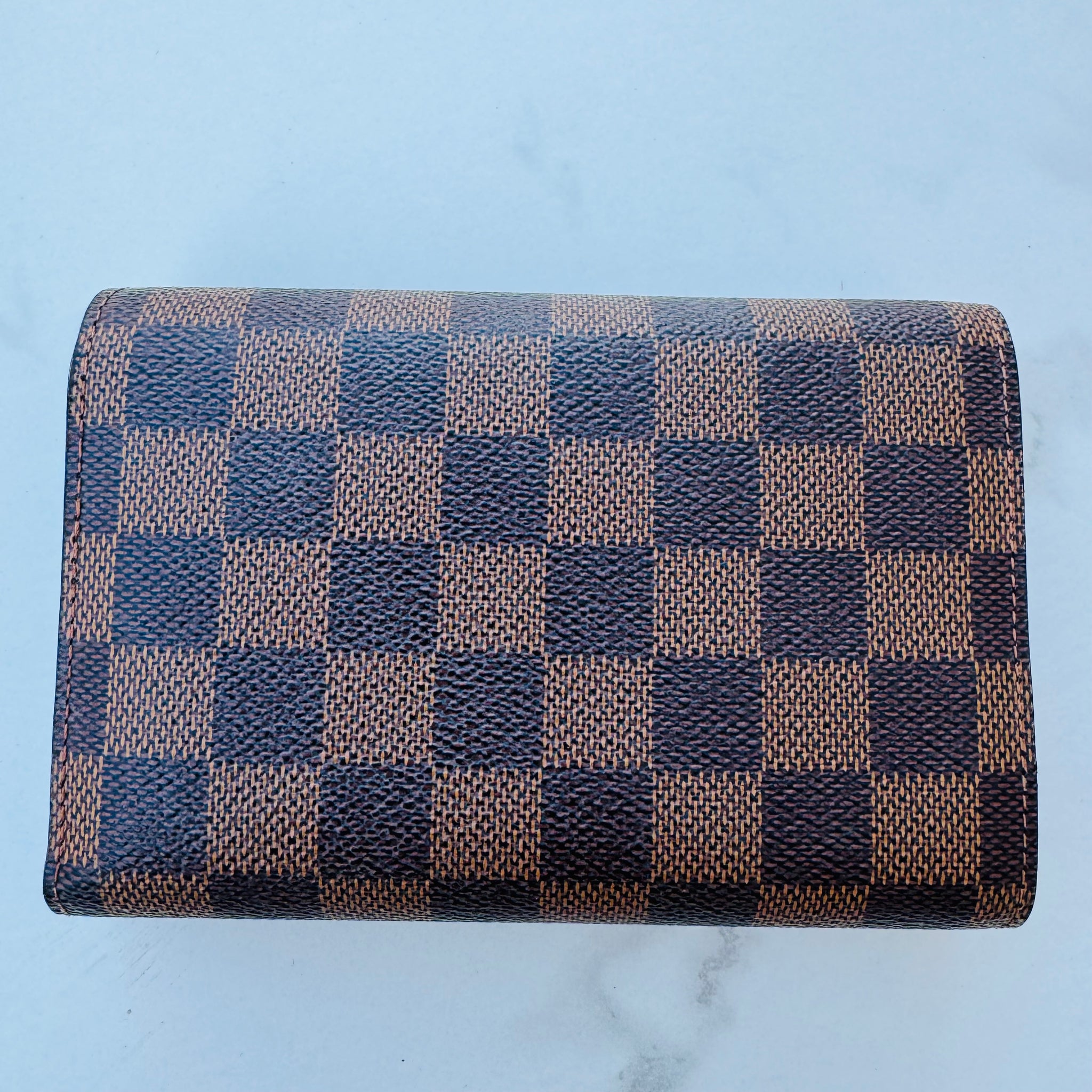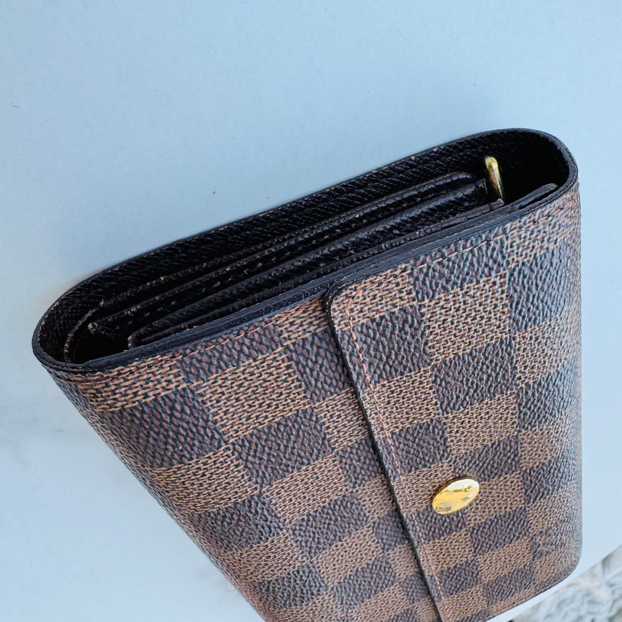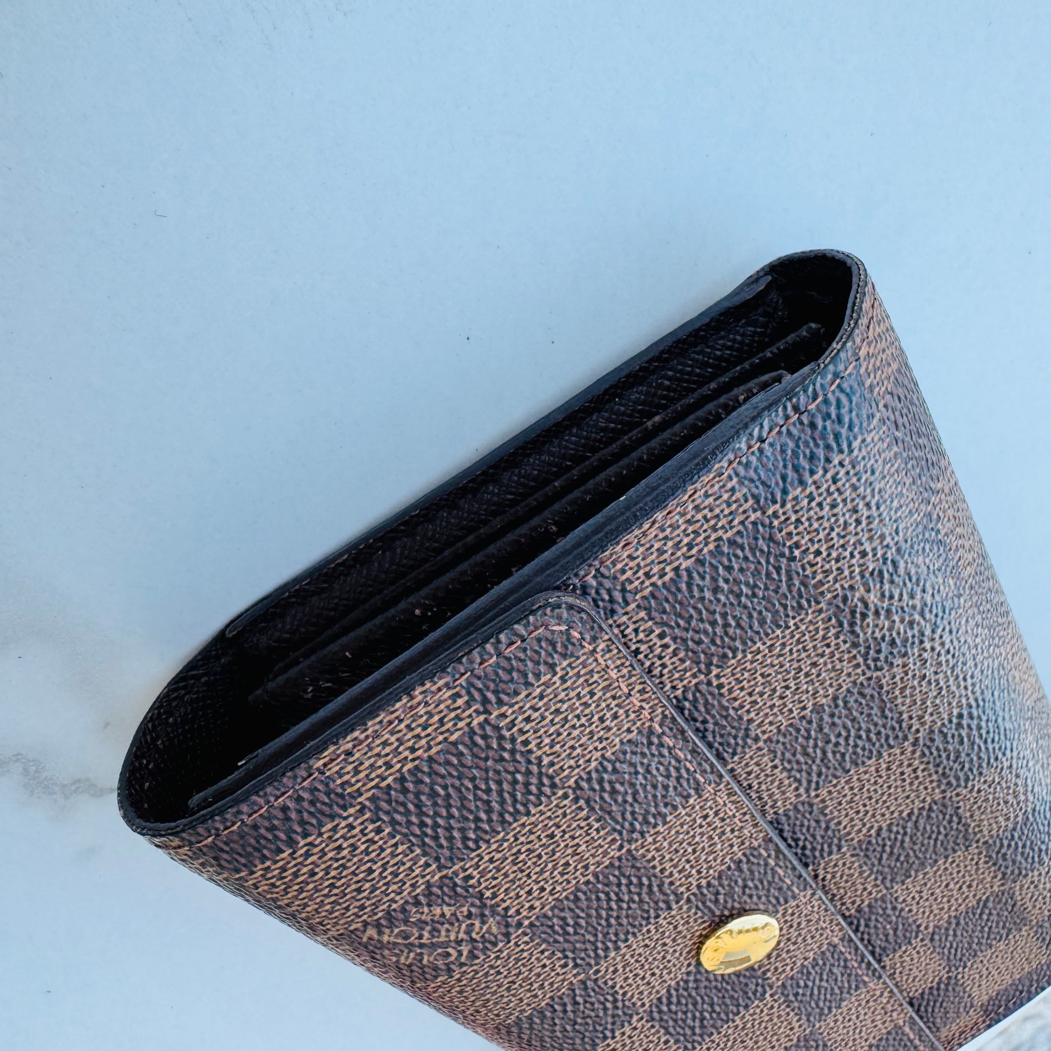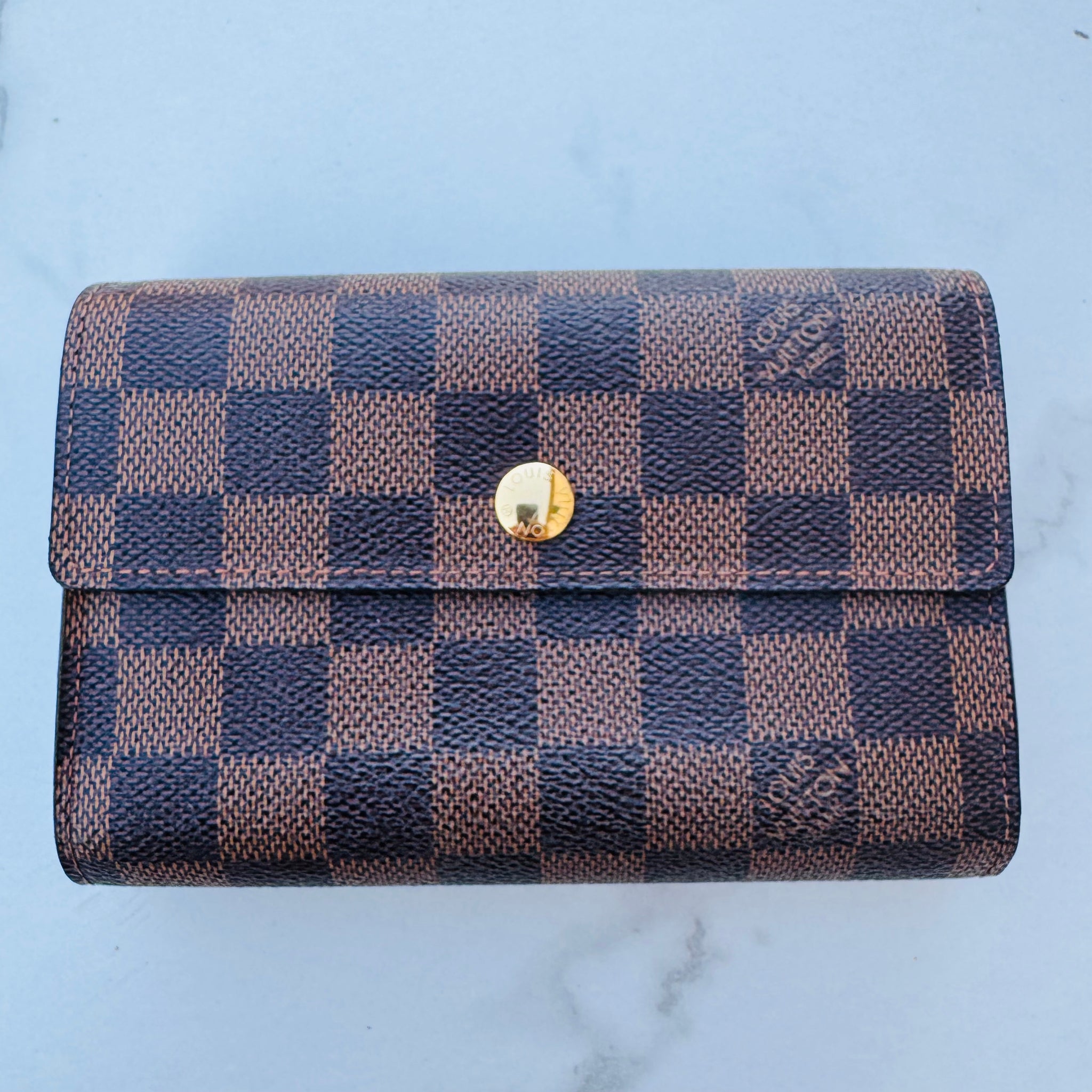 This is an authentic LOUIS VUITTON Damier Ebene Alexandra Wallet. This medium sized wallet is finely crafted of Louis Vuitton's signature Damier canvas. The front flap opens with a brass snap to a compact cross-grain leather interior with a zipper pocket, card slots, and a billfold.