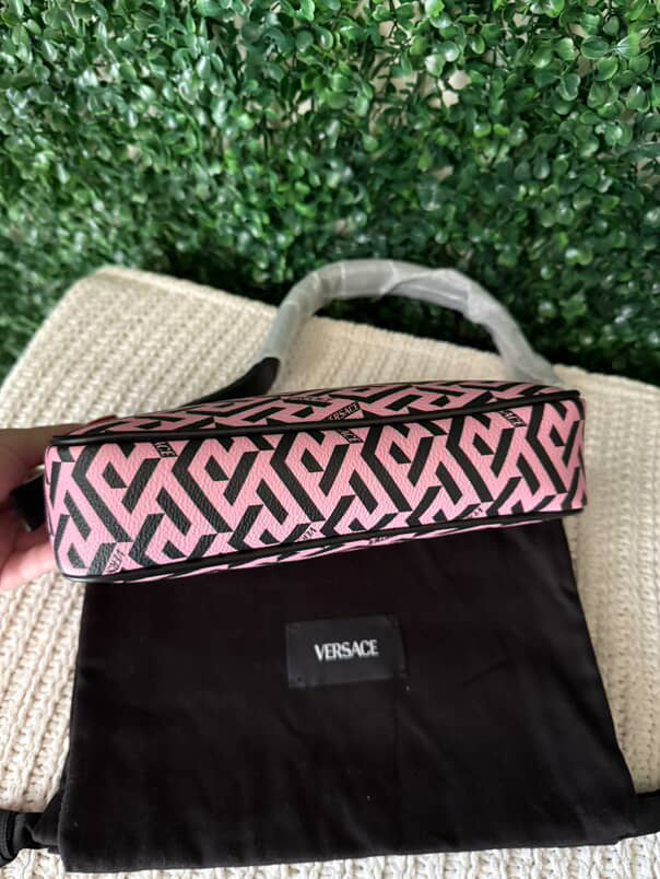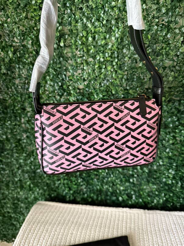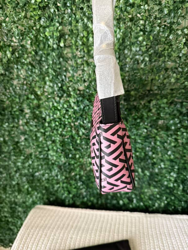 This is an authentic vintage Versace shoulder bag crafted of colorful pink and black geometric coated canvas with leather trim.